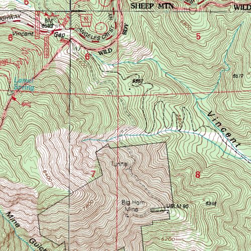 You can see where the trail down Vincent Gulch separates from the road to the Big Horn Mine.  Near the knoll with an elevation of 6562, the trail down Vincent Gulch takes a sharp left.  The old mine road separates from the Vincent Gulch trail shortly before this sharp left turn.  If you look SSE from the sharp turn, you can see that Vincent's cabin is shown on the map.  The abandoned mining road runs above Vincent's cabin and below the road to the Big Horn Mine.