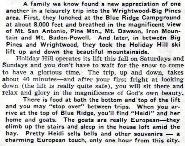Heidi's House on Holiday Hill (present day Mountain High East) is long gone, but it still holds the memories of long time Wrightwood residents. It once sat on top of old Holiday Hill, a little drafty log cabin with a side corral that appeared worn...and smelling sorta like goat. It may not sound appealing to the average reader...but through the middle 1950's and into the '60's, Heidi's House attracted many visitors. Heidi's House was built by ski instructor Hannes Schmidt during the early days of the Holiday Hill Ski area in 1953. Because of a poor snow year and rainy season, Mr. Schmidt took the initiative to build the small cabin of native wood to bring the tourists in. He let owner John "Poppa" Steinmann know of his idea, and then the hammer began to fall as his vision began to take shape. The small cabin was Swiss style, fashioned after the one in the classic story "Heidi" in Switzerland. While the ski instructor built the dream, reality showed up in the form of Heinz Steinmann, one of "Poppa's" sons. "Did the Forest Service know of its construction?" no doubt was his first question.