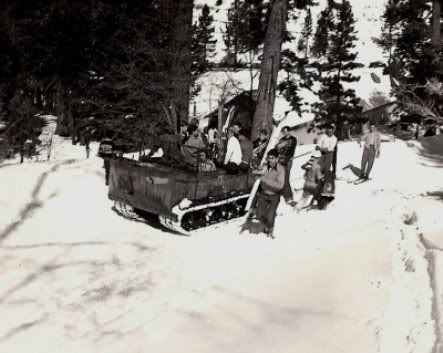 Since 1924 the ol' Big Pines Park was in full swing with summer and winter activity. The winter sports, of course, brought the Winter Carnival and its large crowds for snow play and the amazing professional ski jumpers. Many of them were Norwegian, and they arched through the ski at amazing height and distance. When World War 2 reared its ugly head, attendance in the Park dropped. Amateur college ski jumpers used the massive ski jump as most of the Norwegians left. The nation's able-bodied men went to war and the ski patrolmen were apart of that group. Shortly thereafter, little vehicles called "the weasel" arrived at both Blue Ridge and Table Mountain Ski areas and the funny little things became a way to transport skiers up the hill and the injured down it. For awhile not much was known about the "weasel," its slow speed gave skiers time to take a snort or visit with other passengers as it carted them around. At best, and in ideal conditions, it traveled at 20-30 miles per hour. At least it was more "cool" to ride in than a Desoto. The "weasel" had an interesting history, and if one would see the valuable service it provided to our military serve men and women over seas during the war you would see that it wasn't exactly your normal non-impressive weasel.