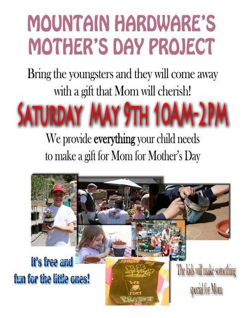 Mountain Hardware will be having their annual Mother's Day Project for Kids program again this Saturday, May 9th from 10 AM to 2 PM.  Each year, the Mountain Hardware folks help the little ones make a gift for Mother's Day that will warm Mom's heart.  Everything is provided to make the gift...there is no cost and our helpers will get the kids off to a good start.  Mountain Hardware has put this together for the past 15 years or so.  Many of the first kids that participated are now parents themselves.