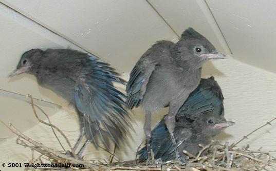 I have found some interesting sites while researching jays. I found that 93% of Stellar's Jays lay 4 eggs. One site that followed 8 clutches had only 3 clutches that had at least one fledgling survive to fly off on their own. I wonder if we are lucky not to have such a high mortality rate. There was also a site that I believe was affiliated with Cornell that had other live nesting cams including an owl cam.