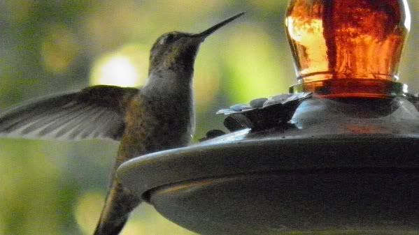 The orioles just love the hummingbird feeder.  Problem is, when they push off to leave, they spill a ton of nectar.  That's one of the main reasons I have to fill them so often.  Not to mention when two get on opposite perches and start that "see saw" motion while drinking...