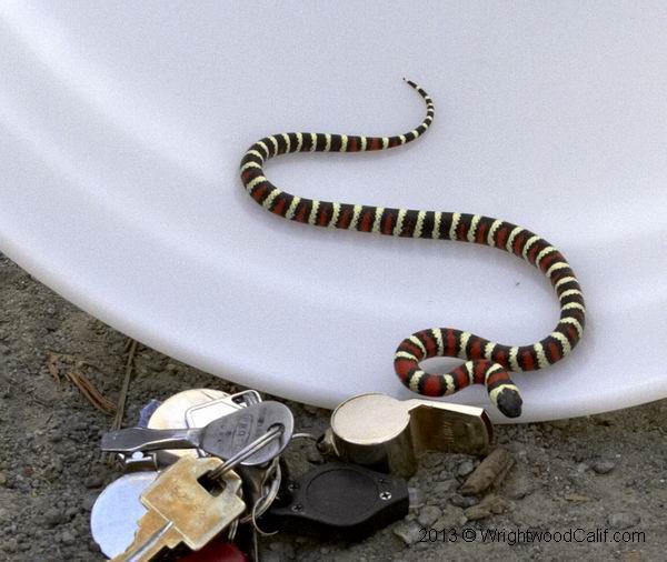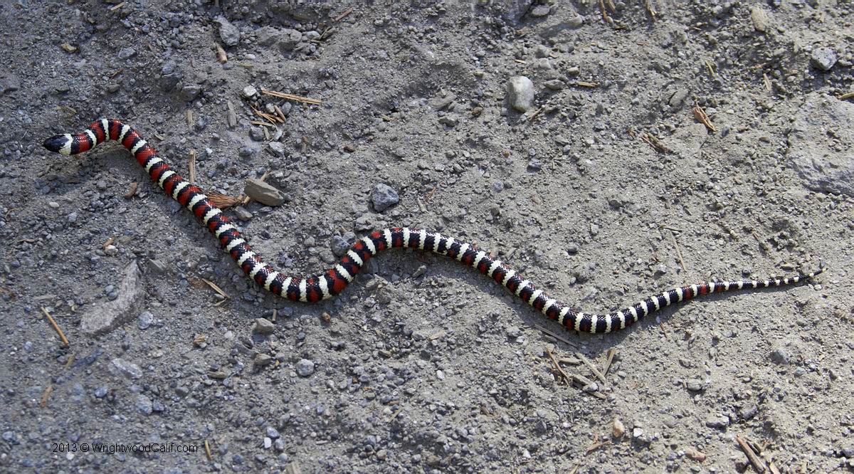 Mountain King Snakes are beautiful snakes, and will eat other reptiles, including rattlesnakes!  They are immune to their venom.  Mountain King Snakes are very beneficial snakes to have around as well as beautiful!  Occasionally people get confused and will kill a King snake, mistaking it for a Coral Snake, but we don't have Coral Snakes in Wrightwood.