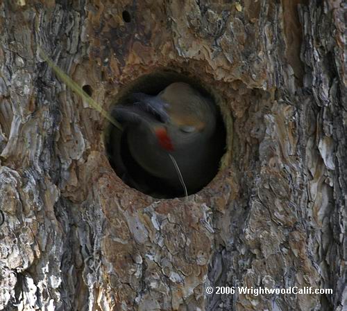 Dad Flicker working on nest. He's removing some pieces of alfalfa that I placed in the nest for bedding material as I didn't have any wood chips at the time.