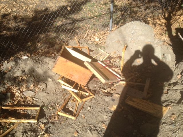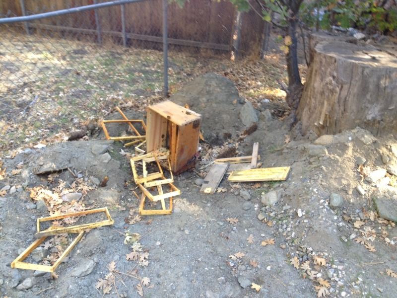 Totaled our bee hive.  >:( :o :(  again!   We are not going to set up another hive until we build a bear proof fenced enclosure