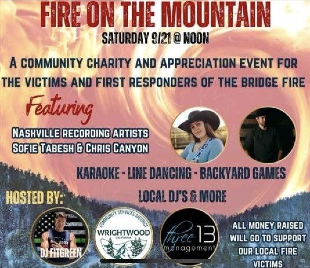 Come join us for a community-hosted charity event featuring local DJs and singers, benefiting our neighbor victims of the Bridge Fire and honoring our first responders who saved our town! We’ll have “Fire DJ Sets”, (pun intended) guest singers, line dancing, karaoke, back yard games, and events all with the goal of raising money for our neighbors who lost property and stimulating our local businesses who lost a whole week of work. We’ll be recognizing our local heroes with the out which we would not have a town so come thank many of them in person! It’s last minute and starts at noon this Saturday, but we’ve all proven how great we are at last minute. Set your calendar aside and bring your families out where we can finally come together and enjoy our town which we’ve missed so badly! See you all there!!