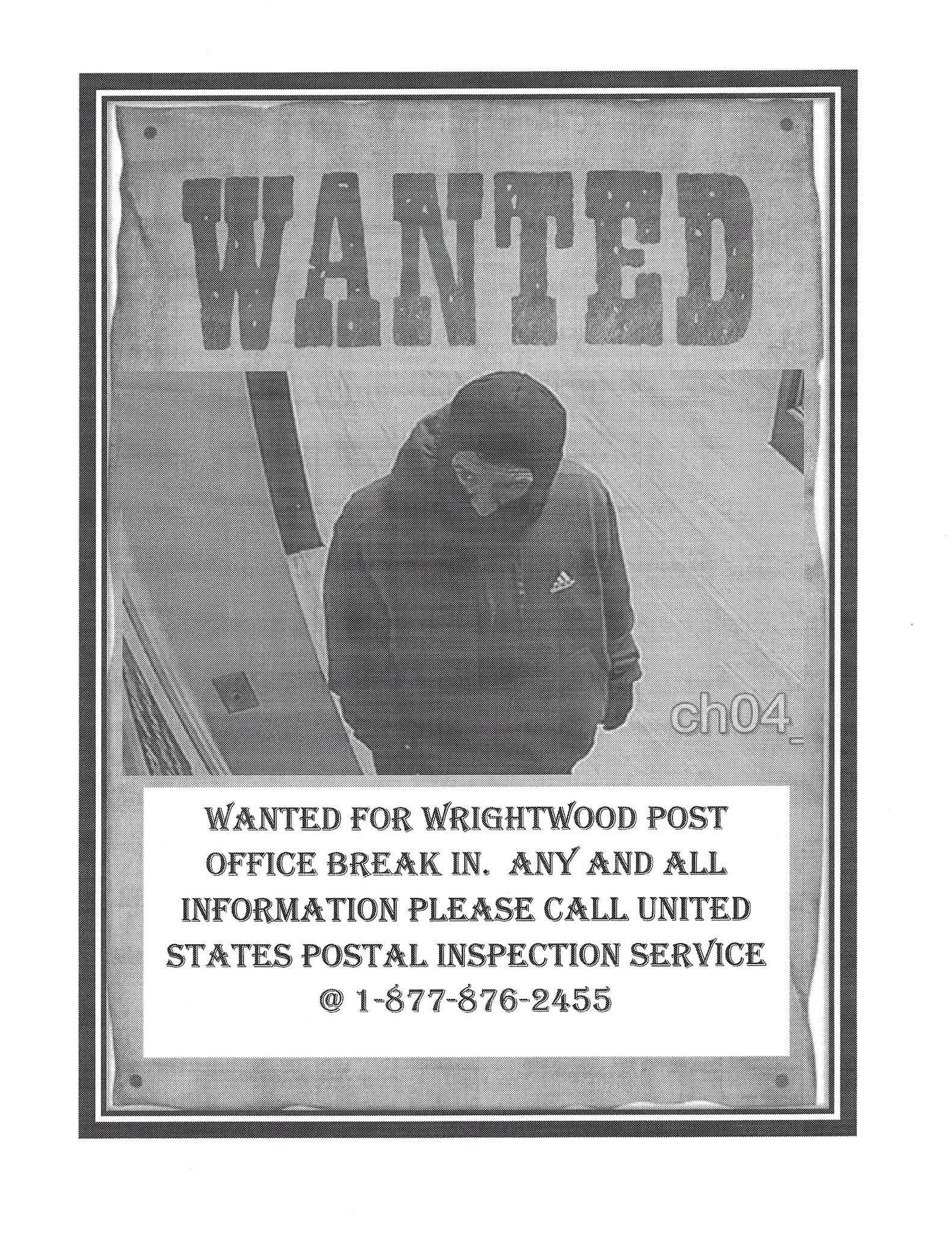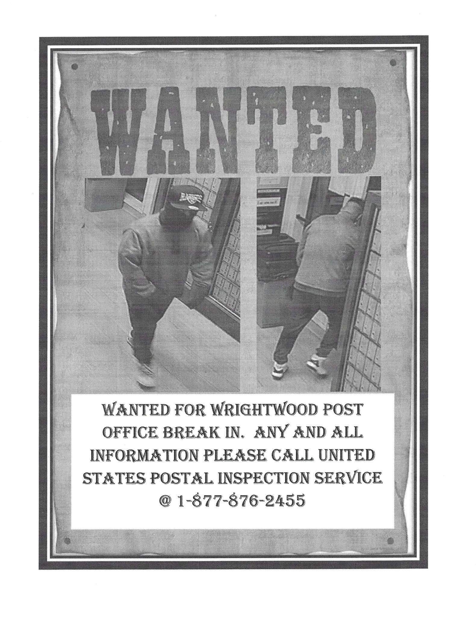 Wrightwood Post Office Break-In March 2024 - Please share these far and wide. The PO has flyers you can take as well. Note that you can see a lot of the man's face in the first image. In the second image, one of the men took off their mask/hat and you can see his partially shaved head/hairline. The Post Office is working on getting additional security measures in place. Yes, mail was stolen but it's not clear exactly what. Some packages and some mail from boxes in the back were taken. They appeared to have been scared off, potentially by headlights, and left quickly out the back, so if you came to the post office that night please let the staff know if you saw anything.