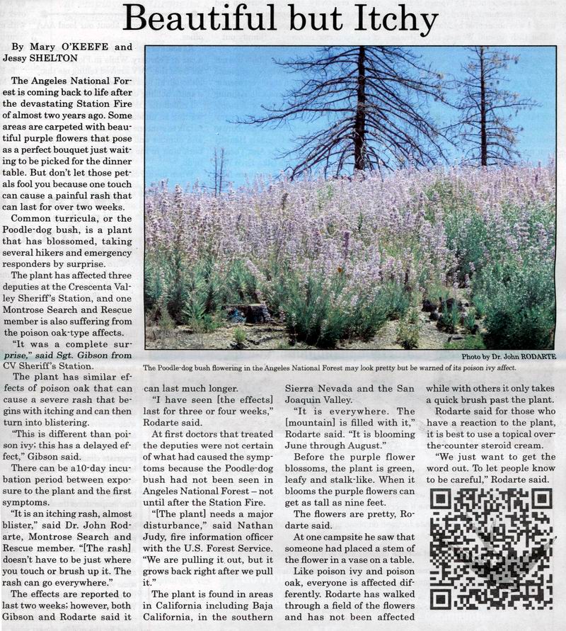 http://www.pcta.org/2013/poodle-dog-bush-warning-8891/Poodle-Dog Bush, Eriodictyon parryi, is common in parts of Southern California. Touching it can cause a significant allergic reaction.