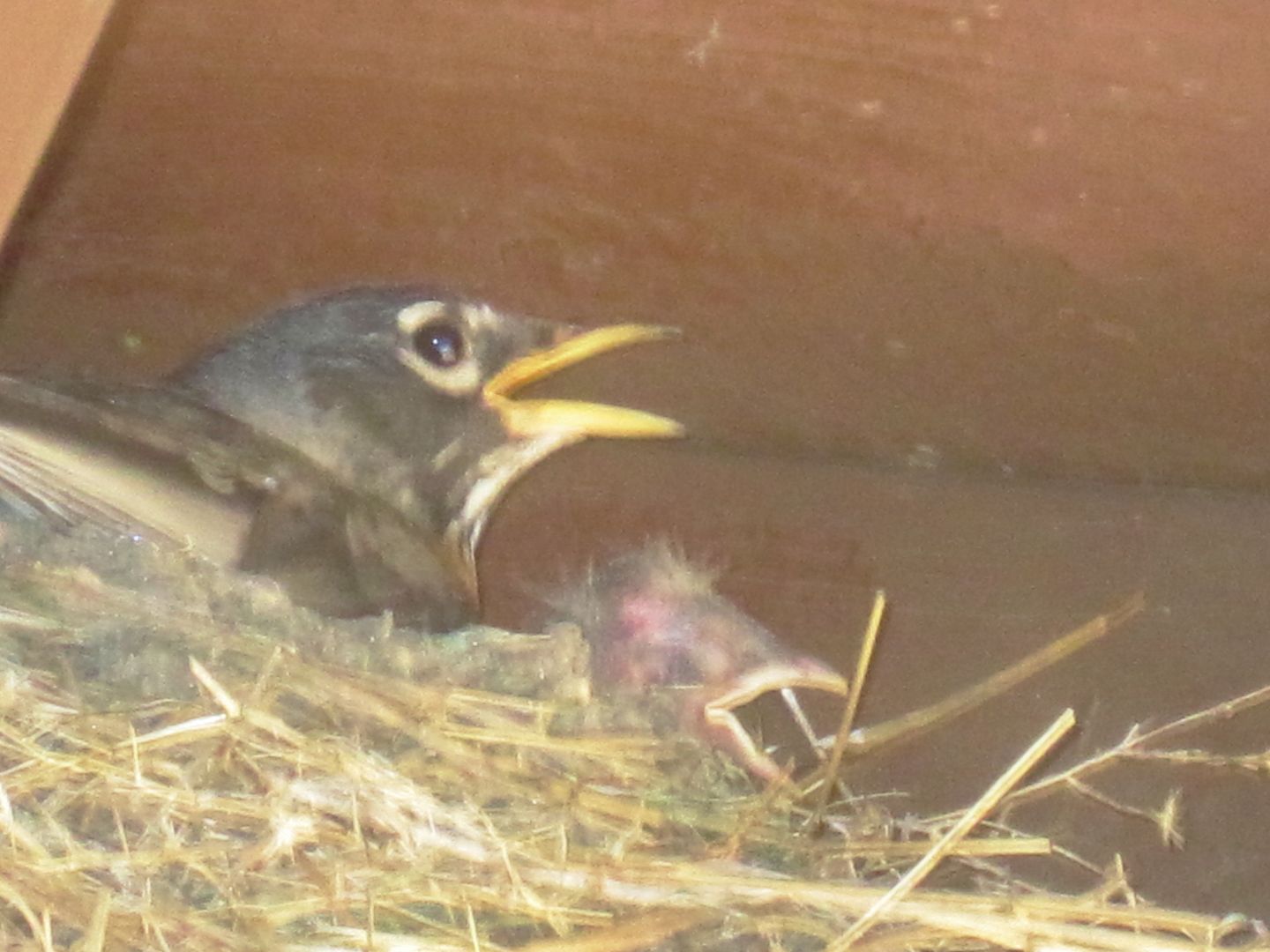 Wow konaluvr that is a great photograph of the nesting birds at your house, Thanks for sharing it with us.  This afternoon I turned on a sprinkler to water the small green lawn in my backyard and a adult American Robin immediately came over to take a bird bath under the sprinkler.  The whole time the bird was shuttering feathers under the water and picking off insects in the lawn.  I like having them around since they eat insects in the grass.