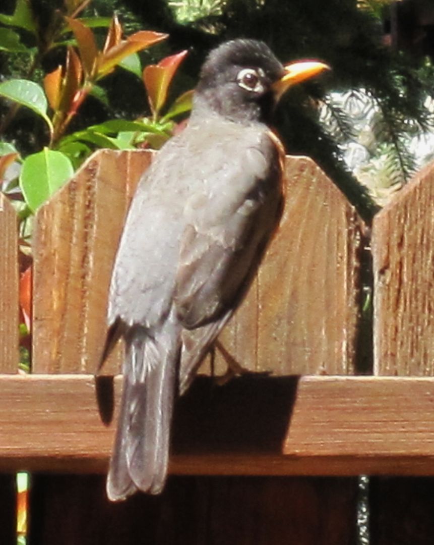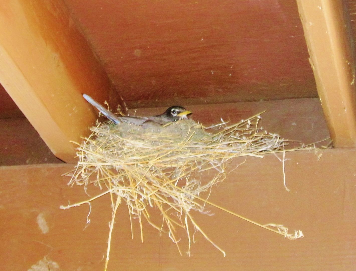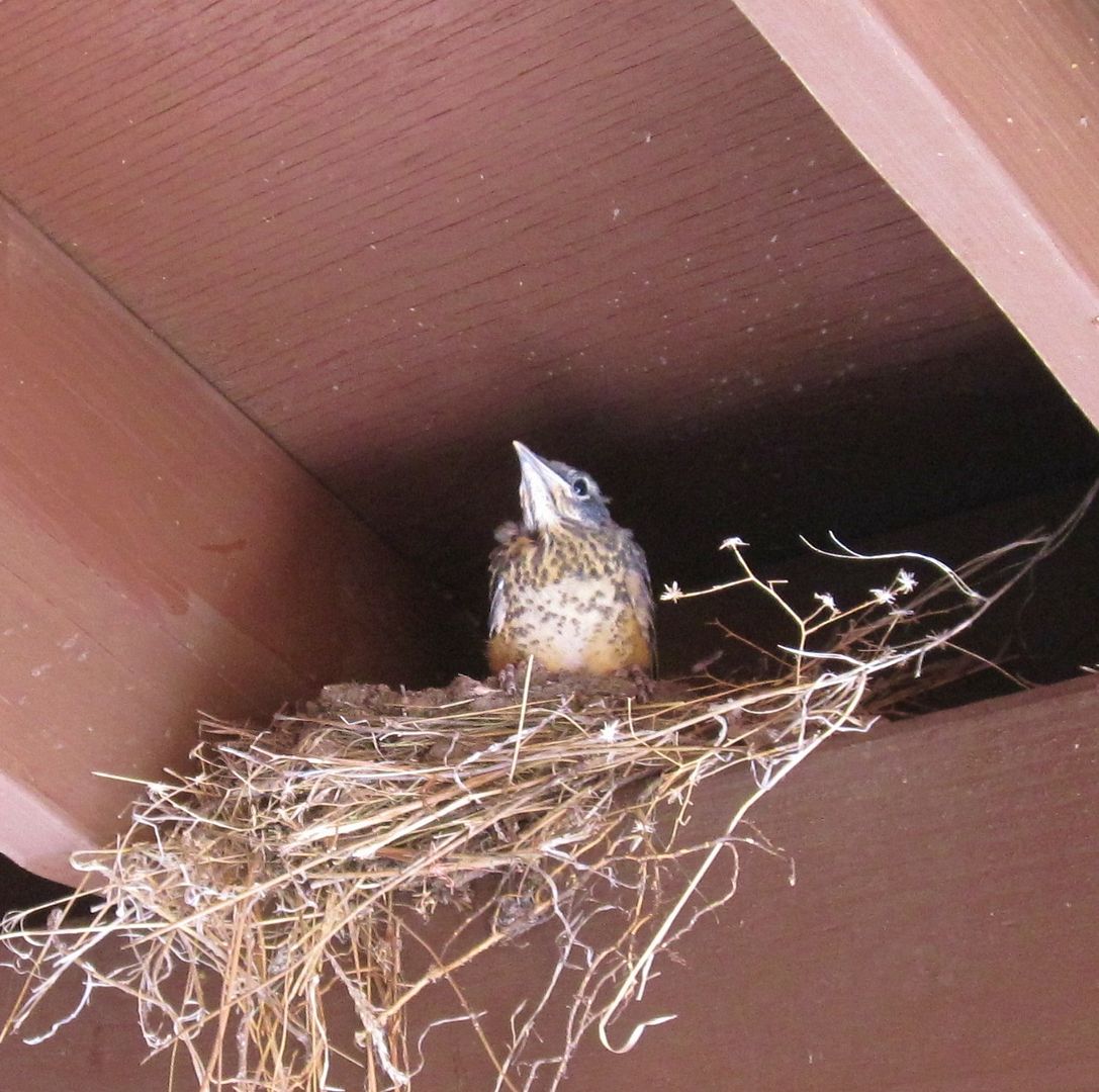 Well my baby robin has flown the nest.  I was away for 5 days and when I checked the nest, it was empty.  Interestingly, the inside of the nest looks like a mud bowl, very hard with dried plant material all around the outside.