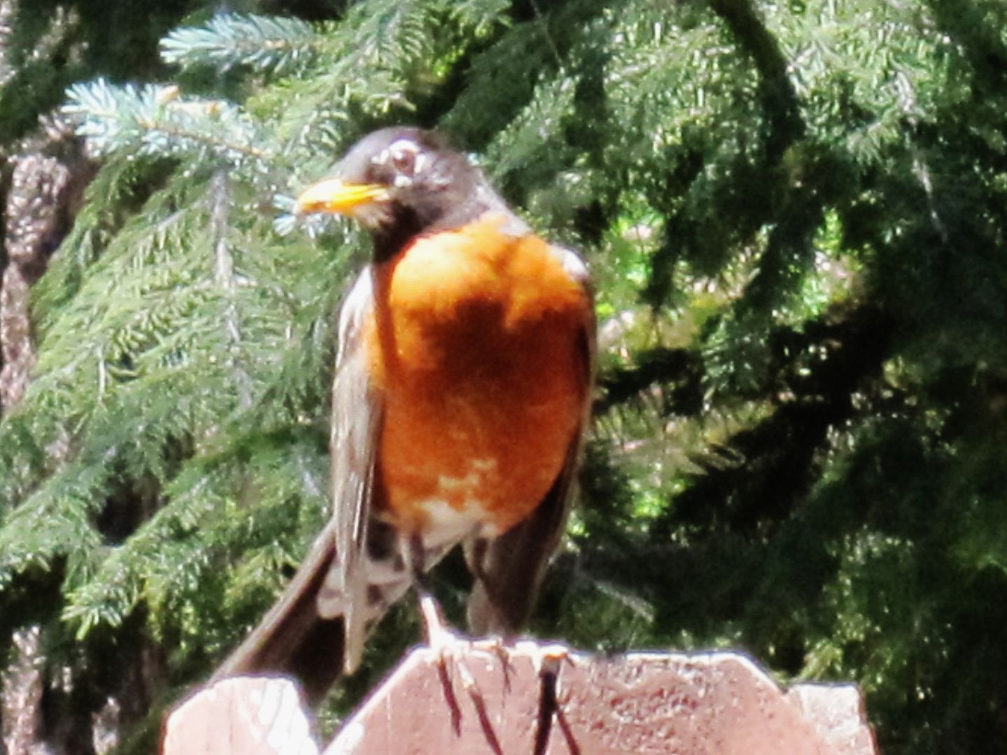 This beautiful bird is an American Robin, how fortunate you are to have them nesting at your house.  We had several birds nest successfully at our house near the County Line including western bluebird, orioles and black birds.  I really did not care for the black birds since they are nonnative but last season a young oriole fell out of the nest in the yard and was quickly attacked by a Copper's Hawk.  The black birds swarmed the baby oriole protecting it from the hawk until my wife was able to put it back into the nest tree in a safe location.  Since that experience I do not mind the black birds hanging out for the nesting season. All of the birds were back again this season nesting in the same trees as last year and in some cases on the same braches.