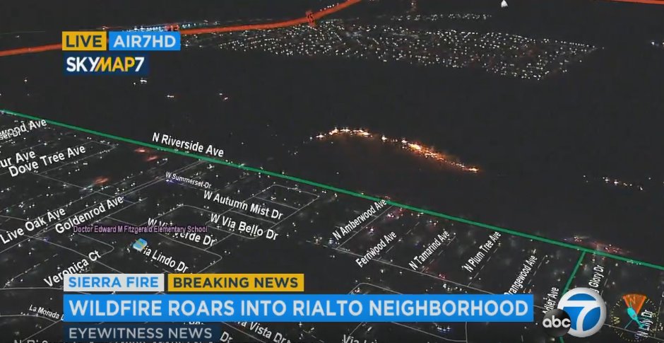 #SierraFire(Update): Fire continues to grow to the south under influence of #SantaAnaWinds. Structure protection in place along Riverside Ave. NO EVACUATIONS are in place at this time.
