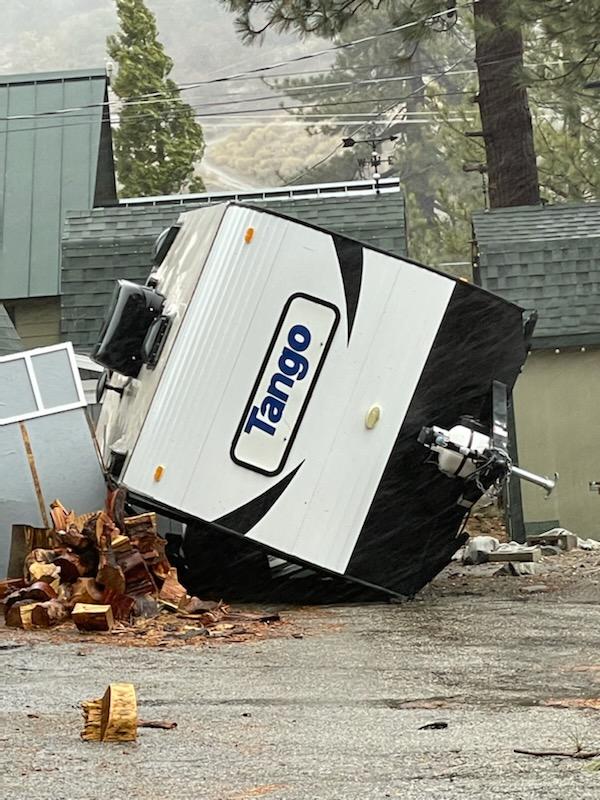 Multiple reports of wind damage on the West side of town. Trees down onto structures and power lines - travel trailer overturned