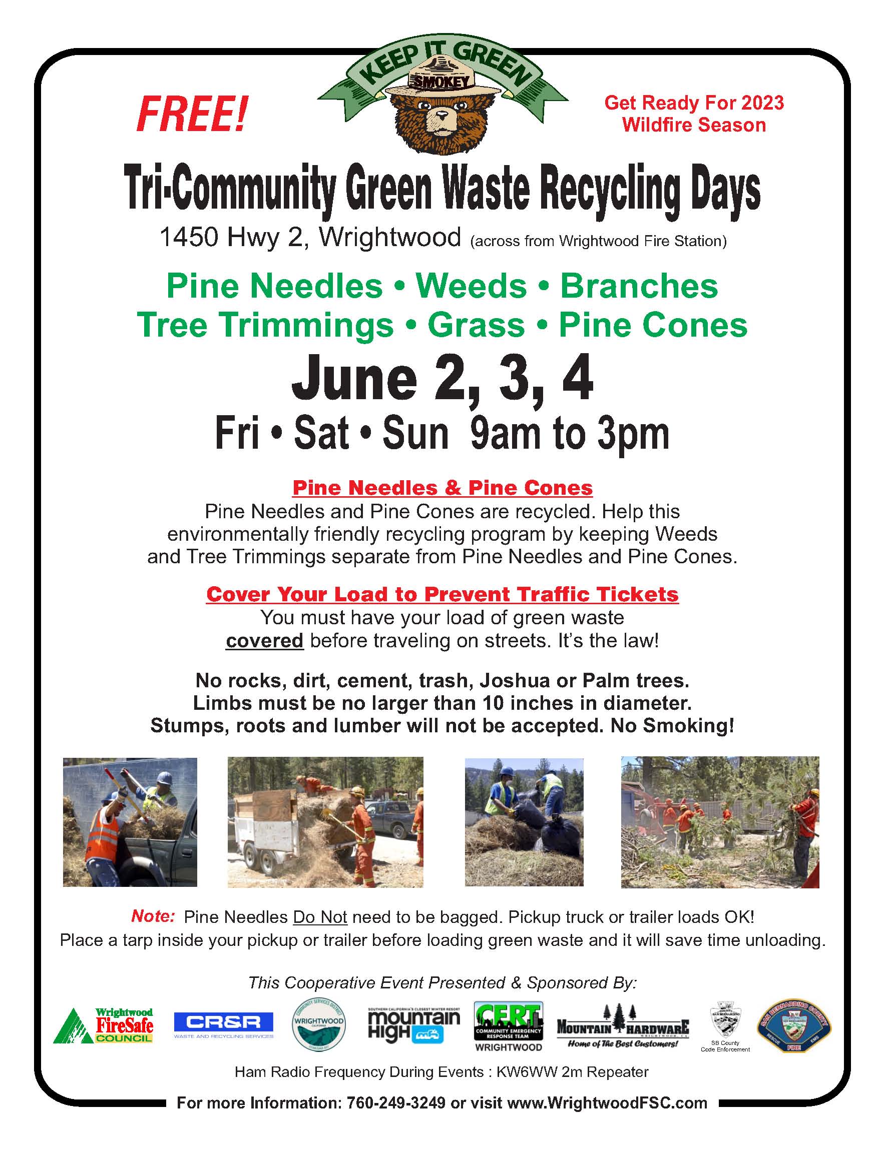 The Wrightwood Fire Safe Council (WFSC) is very pleased to announce that the Tri-Community Green Waste Recycling Days will return in June 2023. Please see the flyer for all the information.