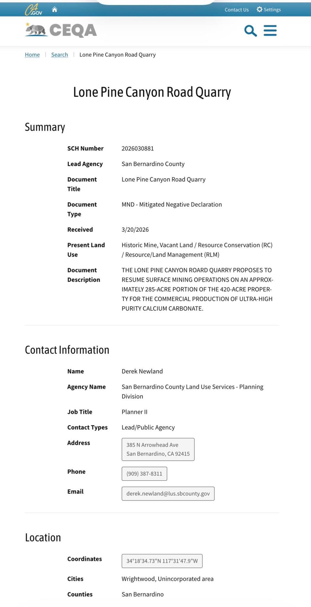 The Lone Pine Canyon Road Quarry proposes to implement a Reclamation Plan (Project)