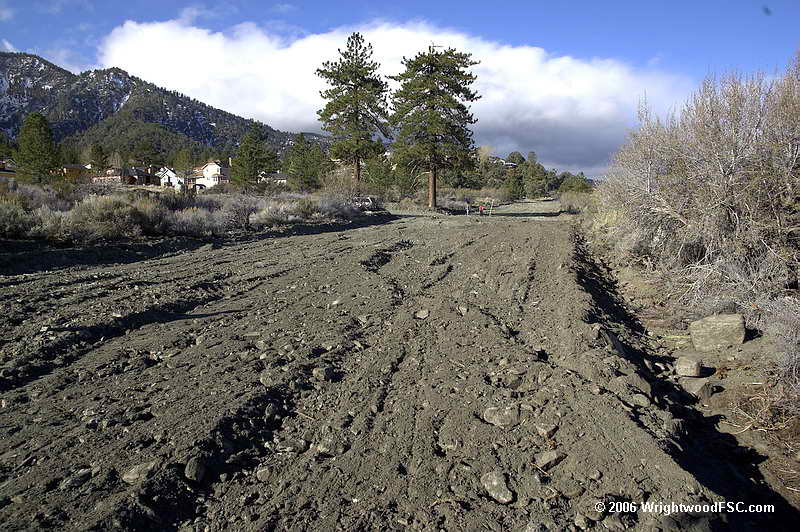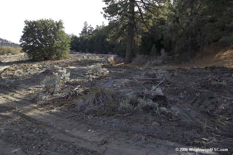 Of all the areas of Wrightwood, the homes that look over the undeveloped area to the north are perhaps at greatest risk for wildfire.  Take a hike down to where the work is being done and look back up.  What you will see is massive amounts of old growth chaparral that grows right up to and under the decks of the homes overlooking the valley.  Remembering that fire will race up that slope with flame lengths over 100 foot when it crests the top and you can see the concern.  In a perfect world, the homeowners would have the slope cleared down a hundred feet or so.  Putting in fuel breaks at the bottom will help stop a fire from making it to the slope and thus the homes.