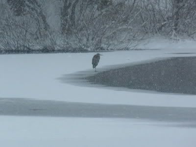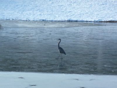 I have taken a couple pictures of the Blue Heron. These are taken from my truck. It was walking on the ice looking for the gold fish swimming underneath. The other picture was during a storm and I thought the thing looked pitiful.