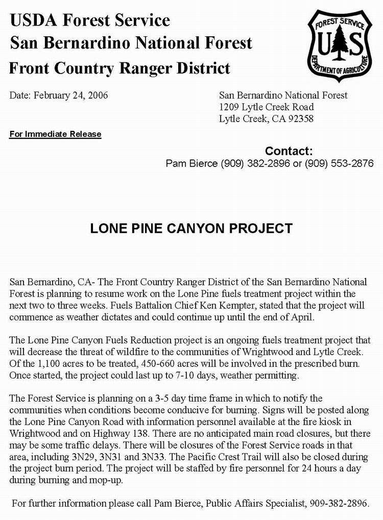 The Forest Service will be at the Wrightwood Fire Safe Council meeting on Tues 3-21-06 to discuss the status of the pending prescribed burn.