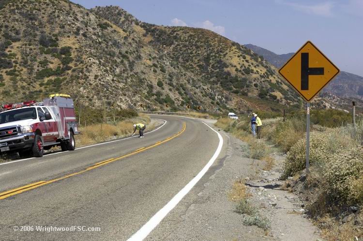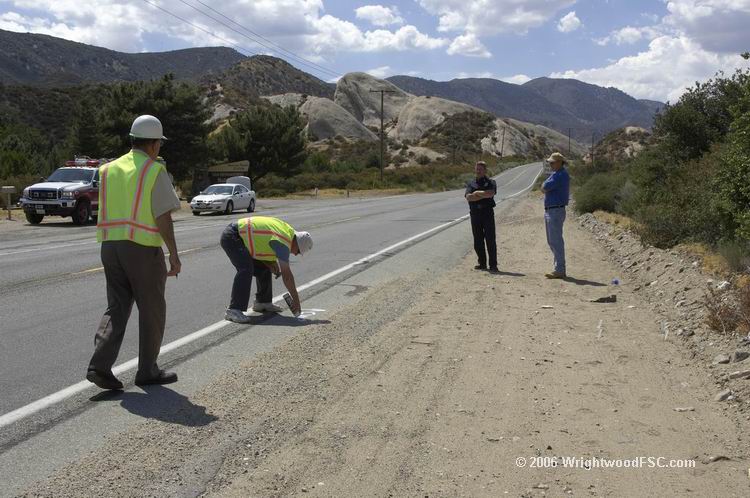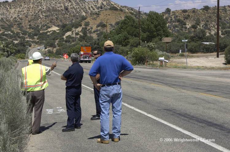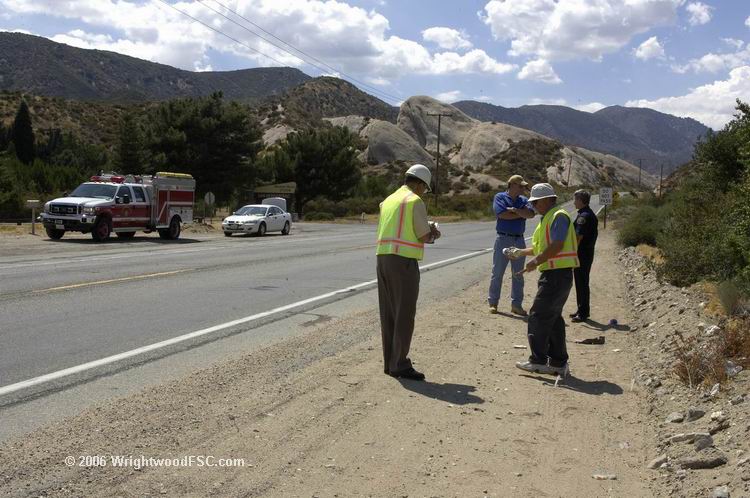 County engineers, Wrightwood Fire Station and Wrightwood Fire Safe Council members survey prospective location for the new signs.