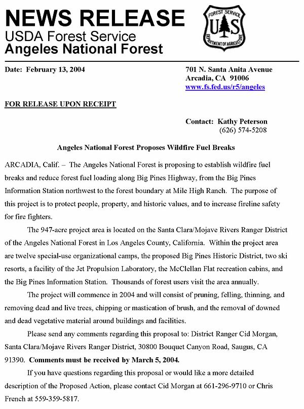 In Nov 2004 crews began marking trees for removal along Big Pines highway and in Dec 2004 ANF fire crews from Valeyermo started reducing dense areas of scrub oak and chamise 2-3 miles below Jackson Lake.